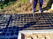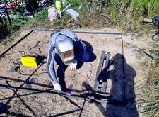 Приступив к работе, мы, первым делом, очистили могилу от травы. Затем положили по периметру места захоронения пятисантиметровую металлическую полосу, которая будет служить границей и дополнительной опорой брусчатке. Получившийся прямоугольник свариваем по углам.
