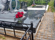 Устанавливаем надгробья. Справа располагается старый гранитный памятник, слева – композиция, изготовленная из полимеров. Скульптуры предоставлены клиентом и были сделаны в другой мастерской, сами они лёгкие, по текстуре и цвету похожи на камень.